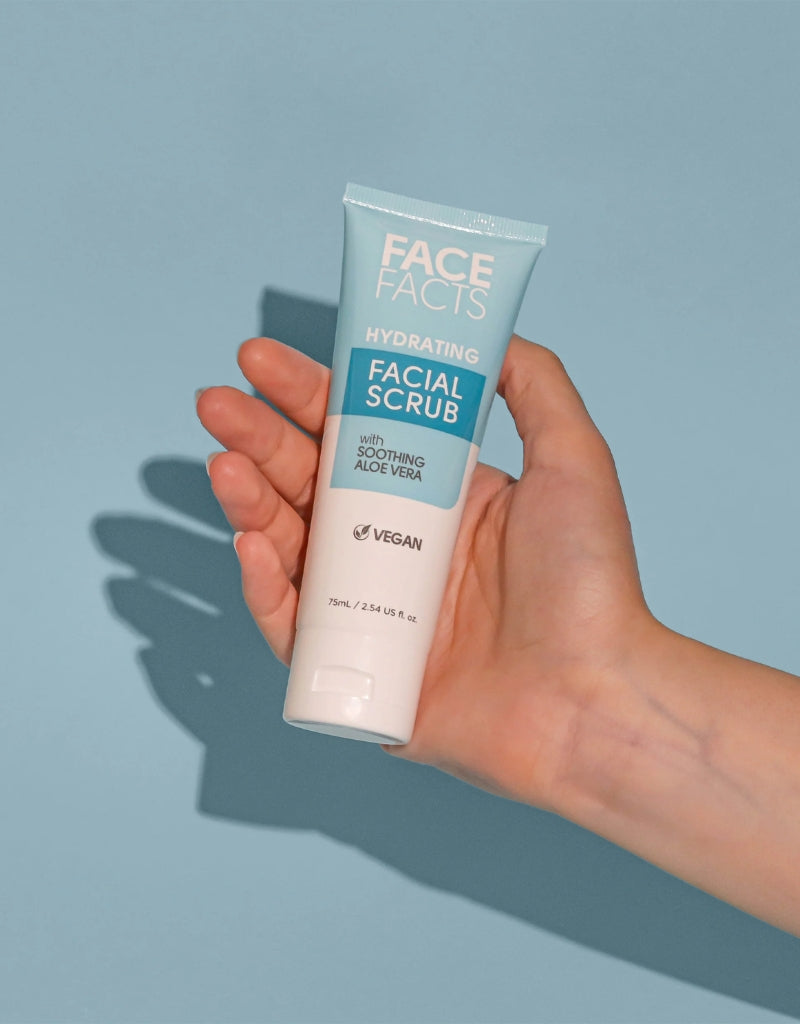Face Facts Hydrating Facial Scrub with Aloe Vera gently exfoliates and refreshes your skin in one simple step. This 75 ML formula combines ultra-lightweight jelly with fine exfoliating powders to remove dead skin cells without harsh scrubbing. Aloe vera soothes and hydrates while you cleanse, leaving skin smooth and refreshed. Perfect for all skin types seeking a gentle yet effective exfoliation. How to use: Wet your face with warm water. Apply a small amount and massage gently in circular motions. Rinse thoroughly with warm water and pat dry. Use before your regular cleansing and toning routine for best results.