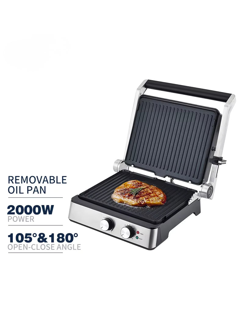 This electric grill features a robust 2000W power capacity and is constructed from durable stainless steel. It includes a non-stick coating for easy cooking and cleaning. The upper grilling surface measures 26x26x16.5 cm, offering ample space for versatile use.