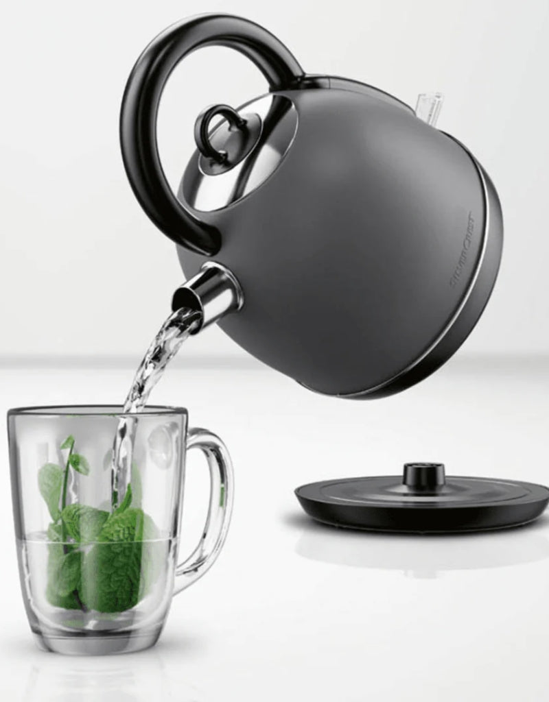 Crafted from stainless steel, this high-performance kettle operates at 2400 W, offering a 1.8-liter capacity. Its sleek gray finish complements its design, while the removable limescale filter ensures clean, pure water every time.